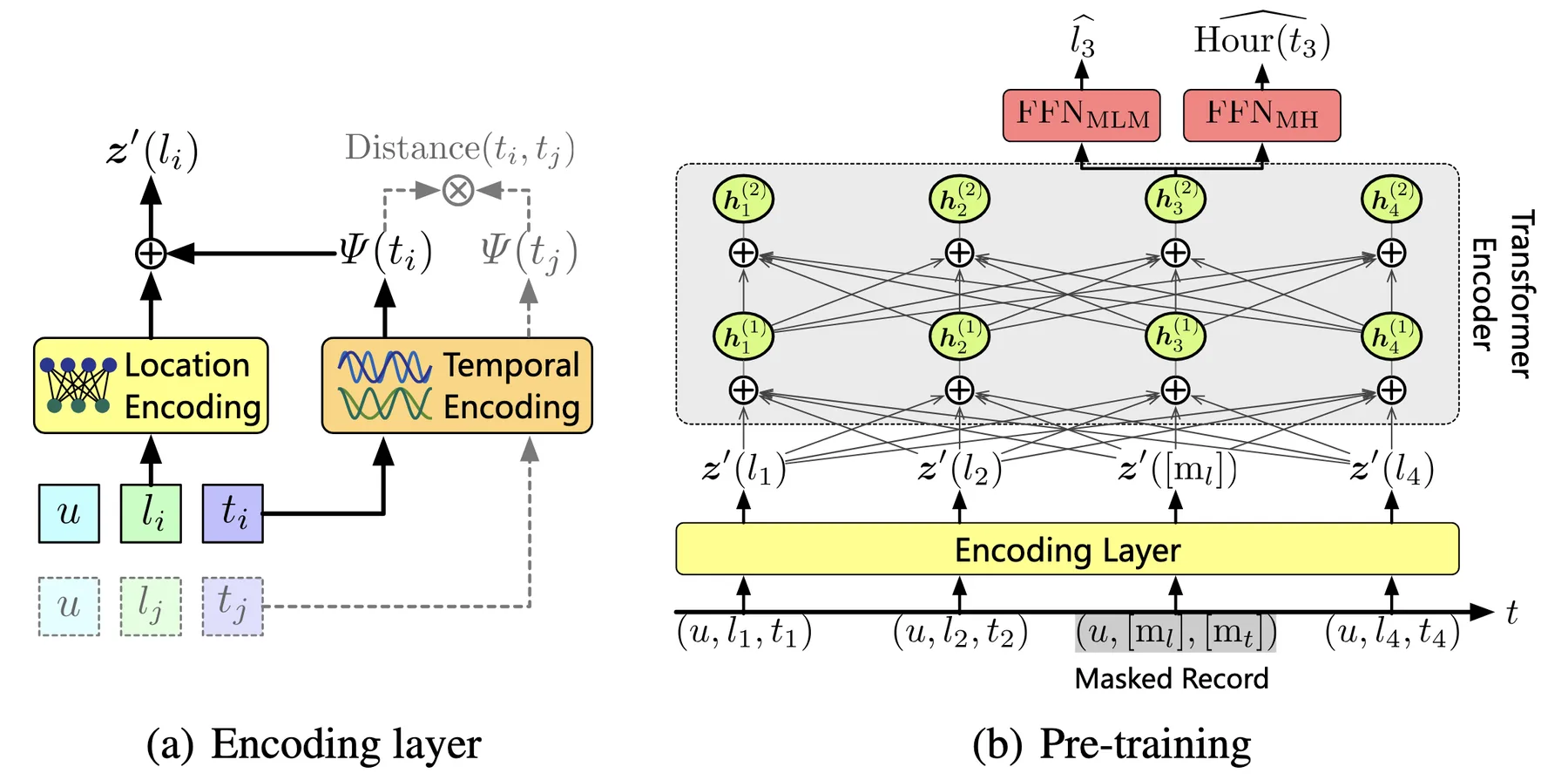 The second design is an additional self-supervised objective called masked hour (MH) prediction: for each masked position, the model also predicts the hour of day when the visit occurred. This auxiliary objective shares similar motivation with TALE, that different location types have distinct temporal visit patterns. By predicting visit hours, the model learns to associate locations with their temporal characteristics.